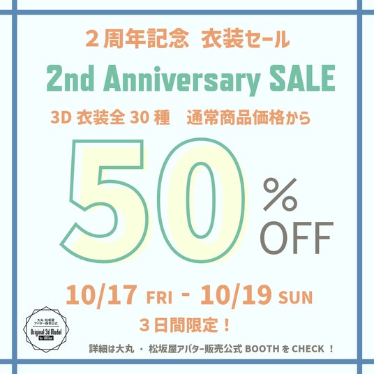 大丸・松坂屋アバターをご愛用いただいている皆様への感謝を込めて、アバター販売開始から2周年を記念し、BOOTH「大丸・松坂屋アバター販売公式」にて、3日間限定で販売開始後初!となる3D衣装セールを実施します。30種の衣装を通常商品価格から50%OFFにて販売します。