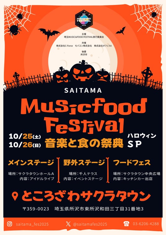 FoodFes株式会社(代表取締役社長:稲垣一馬)は、2025年10月25日(土)、10月26日(日)に埼玉県所沢市で開催される「【音楽と食の祭典】埼玉MUSIC&FOOD FESTIVAL ハロウィンSP」にてフードエリアプロデュースを担当します。