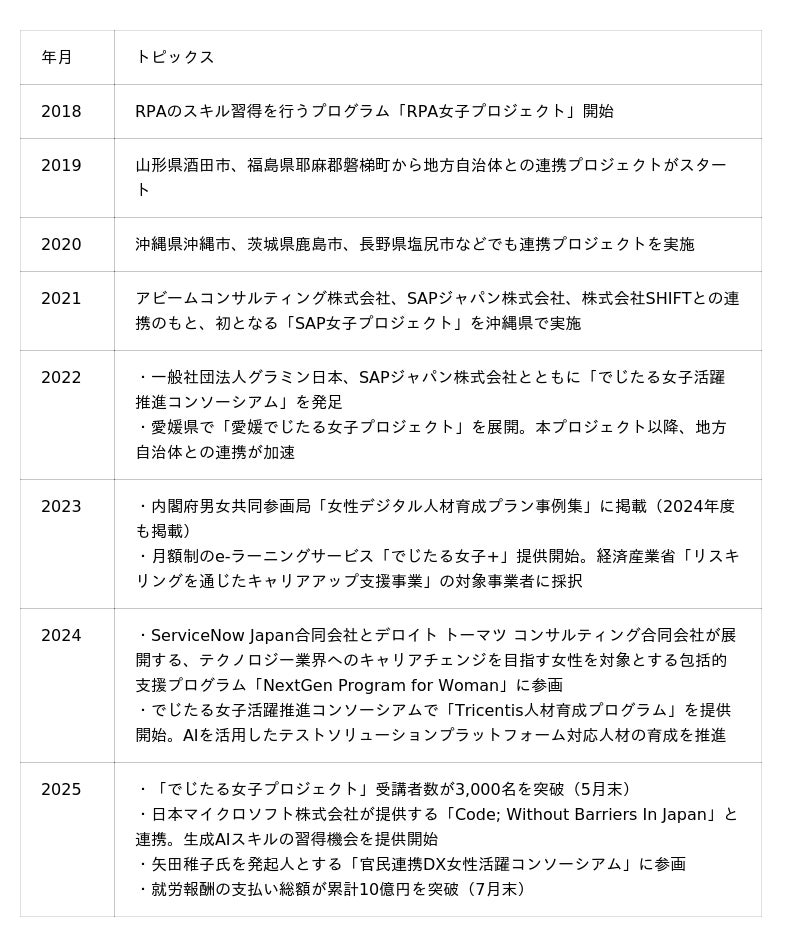 「でじたる女子プロジェクト」は、女性はもちろん、社会のニーズにも応えながら成長を続けてきました。これまでの主なマイルストーンは以下の通りです。