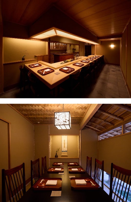 京都にて数寄屋建築を研ぎ澄ましてきた職方の手により、古材や時を経た石を用いた、唯一無二の空間となっています。茶の湯の精神に通ずる「侘び寂び」と「用の美」を基調としたしつらえの中で、 移ろう季節を一皿ずつ丁寧に映してまいります。
