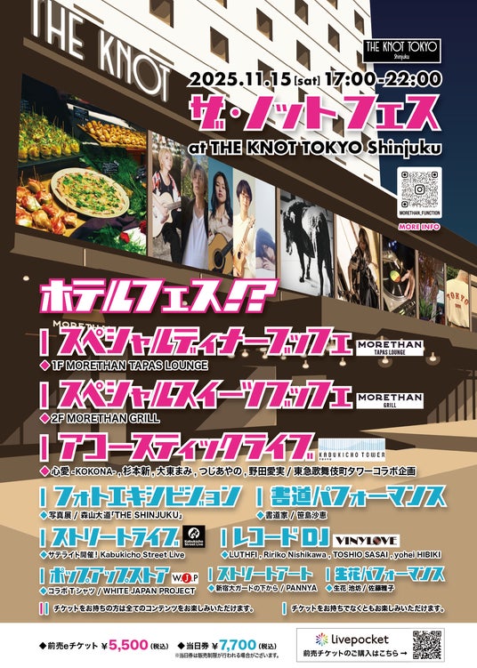 ホテルオープンから7年を迎え、このたび、はじめてホテルで行われるフェス「THE KNOT FES」を開催いたします。「THE KNOT FES」では、主に「新宿」をテーマとしたさまざまなコンテンツを通じて「ホテルを遊ぼう!」を表現します。MORETHAN TAPAS LOUNGE & GRILLでは、スペシャルディナー & スイーツブッフェ(飲み放題込み)もお楽しみいただけます。前売eチケット5,500円(税込)、当日券7,700円(税込)となっております。