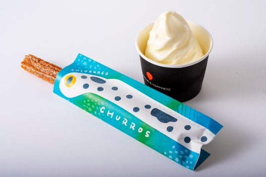 チュロスをバニラアイスに付けて食べる、甘くて贅沢なセットです。