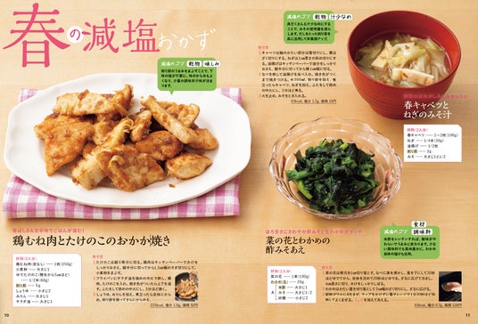 むくみをはじめ生活習慣病の元凶でもある塩分過多。適度な塩分でおいしくいただけるレシピを四季折々の食材をまじえて提案します。「だしは引かず、ともにいただく」、「旬の食材の甘み、うまみをいかして料理の味を引き立てる」など、上島先生が実生活で得た減塩のコツが随所に散りばめられています。