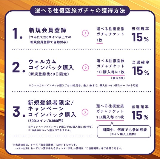 つみたて200コイン以上で、2025年10月16日(木)16:00~10月31日(金)23:59の間に新規会員登録をすると、選べる往復空旅ガチャチケットが1枚獲得できます。