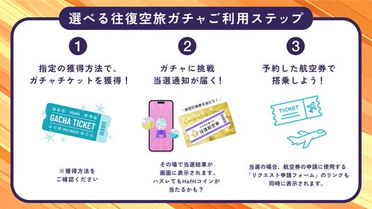 新規会員登録者限定で挑戦できる特別ガチャです。タップひとつで15%の確率で国内往復航空券(引換券)が当たります。さらに今回は、当選後に行き先も選択ができるため、当選後に表示される候補地リストを参考に、選ぶことも可能です。計画通りの旅だけではなく、HafHでしか味わえない、風まかせな旅の始まりを体験をご提供します。