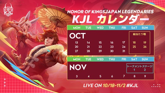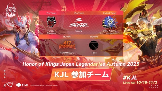 世界で最もプレイされている MOBA ゲーム*1 『Honor of Kings(オナー・オブ・キングス)』は、国内トップチームを決める公式大会「Honor of Kings Japan Legendaries Autumn 2025」を10月18日(土)から開催することを発表いたしました。KJLは、『Honor of Kings(オナー・オブ・キングス)』の日本における公式大会として年に2回開催される国内最高峰の大会で、プロチームに加え、公認コミュニティ大会 「Honor of Japan(HOJ)」上位2チームにも出場権が与えられます。