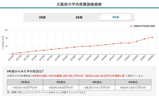 2.2025年9月時点での大阪府全体のマンション価格は9年間で65.5%上昇し、中心部を中心に堅調な上昇基調を継続