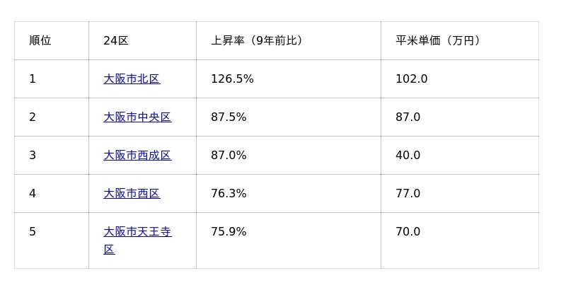 北区は126.5%、中央区は87.5%と高い上昇率で都心部が市況をけん引する一方、ベイエリアの此花区は40.7%、大正区は46.6%と比較的割安水準が続いていることから、エリア間の格差が明確になっています。
