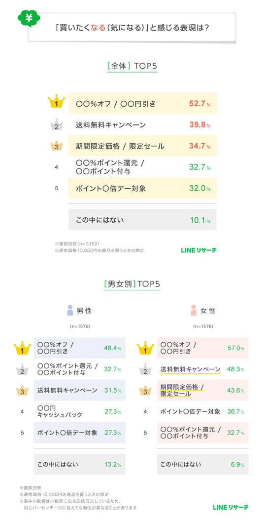 【LINEリサーチ】"買いたくなる"広告表現は「〇〇%オフ / 〇〇円引き」が5割強で1位、一方、「有名人も使っている!」は逆効果?