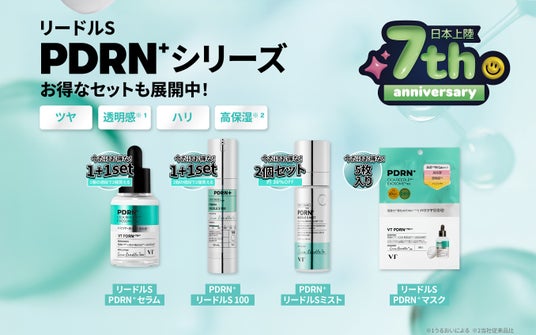 VTは今年で日本上陸7周年を迎えました。皆様への日頃の感謝を込めて、人気のPDRN+シリーズからお得な記念セットを数量限定で展開中!この機会をお見逃しなく!(※PDRN+カプセルクリーム100はセット販売対象外)