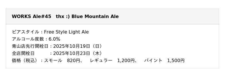 株式会社ワンダーテーブル(本社:東京都新宿区、代表取締役社長:河野博明)は、よなよなエール公式ビアレストラン「よなよなビアワークス」にて、限定クラフトビール「WORKS Ale #45 thx :) Blue Mountain Ale(サンクス ブルーマウンテン エール)」を2025年10月19日(日)より順次提供します。