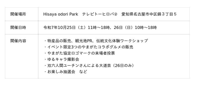 イベントでは、2日間で計23の出店者が、特産品の販売や観光地PR、伝統文化体験ワークショップなどを通じて3つのやまがたの魅力を発信します。当市からは発祥の地として売り出しているハヤシライス、山形市からは郷土料理の芋煮、山形村からはワインやシードルなどの特産品などを販売する他、3つのやまがたの特産品を使ったイベント限定コラボメニューも販売します。会場には、各自治体のゆるキャラが登場し、26日は山県市地域おこし協力隊で岐阜県住みます芸人でもある、双六人間ユーチンさんが応援に来ます。さらに、イベントには当市と連携協定を締結している県立山県高校と県立岐阜城北高校の生徒がボランティアスタッフとして運営に携わり、若い力がイベントを盛り上げます。
