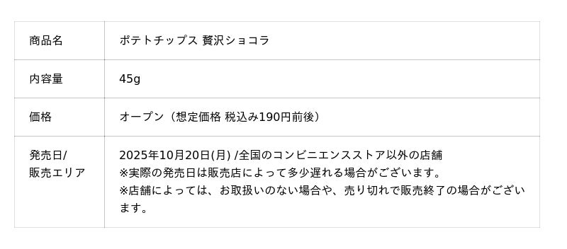 カルビー株式会社(本社:東京都千代田区、代表取締役社長兼CEO:江原 信)は、ポテトチップスにチョコレート※1をかけて甘じょっぱい贅沢な味わいが楽しめる新商品『ポテトチップス 贅沢ショコラ』を2025年10月20日(月)から全国のコンビニエンスストア以外の店舗で期間限定発売します(2026年4月上旬終売予定)。