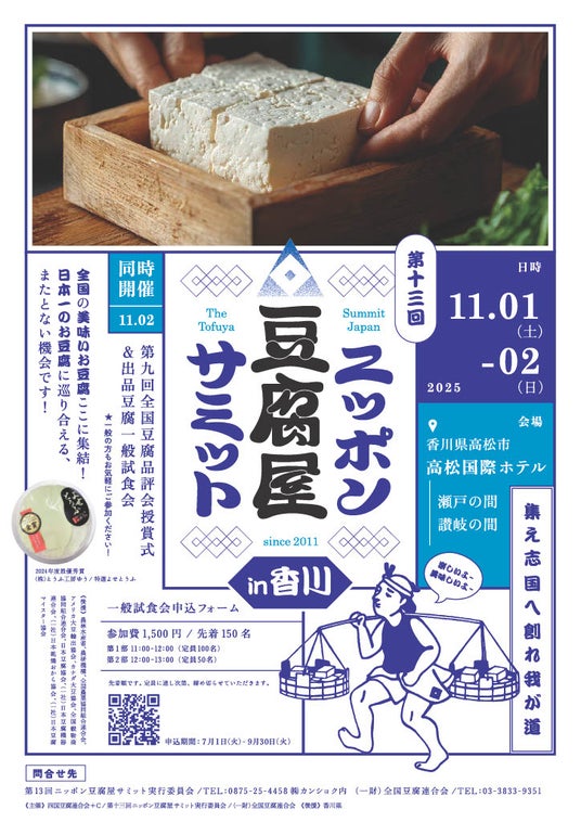 2025年11月1日(土)・2日(日)、香川県高松市にて、「第13回ニッポン豆腐屋サミット in 香川」が開催されます。