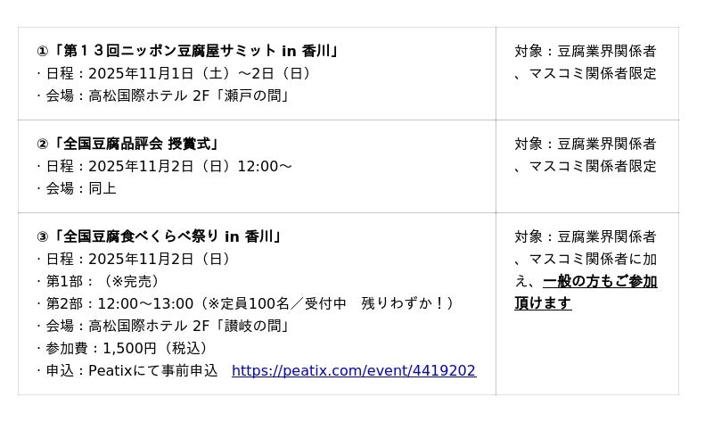 日本の食卓から「手作り豆腐」が消える危機に直面する今、職人の技と文化の継承・発展を目的に、日本最大級の豆腐業界イベント「ニッポン豆腐屋サミット in 香川」を2025年11月1日(土)・2日(日)に香川県高松市で開催します。 2日目(11月2日)には、豆腐業界関係者・メディアを対象とした日本一の豆腐決定戦、「全国豆腐品評会表彰式」を実施。そして同時開催で一般の方も参加できる「全国豆腐食べくらべ祭り in 香川」を開催します。参加費1,500円で、全国の予選を勝ち抜いた約100品の手づくり豆腐を試食可能。日本一の豆腐を決める頂上決戦の熱気と、職人の究極のこだわりを体験することで、食の未来を支える貴重な機会です。