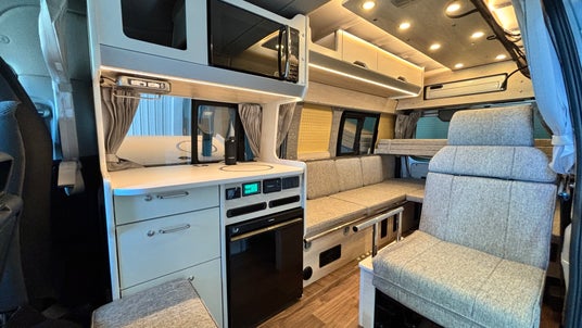 内装:3人掛けシート(2点式シートベルト)、1人掛けマルチシート(3点式シートベルト)、エクステンションマット、床面クッションフロア仕上げ、カーテン、吊戸棚、着脱式テーブル、タオルハンガー、バックドア木目トリム(LED付)