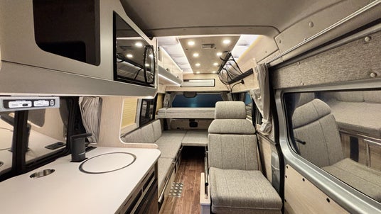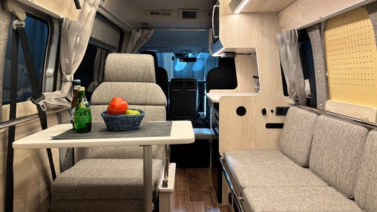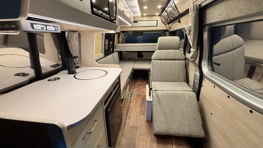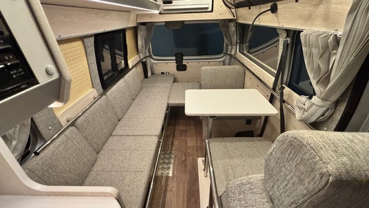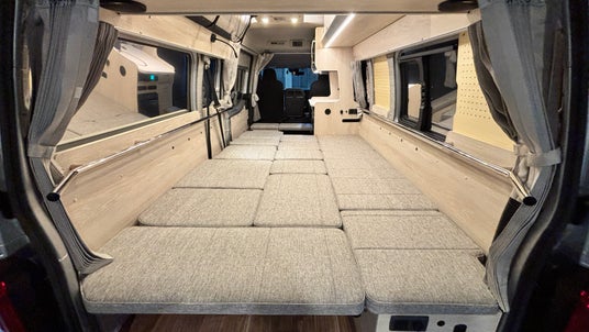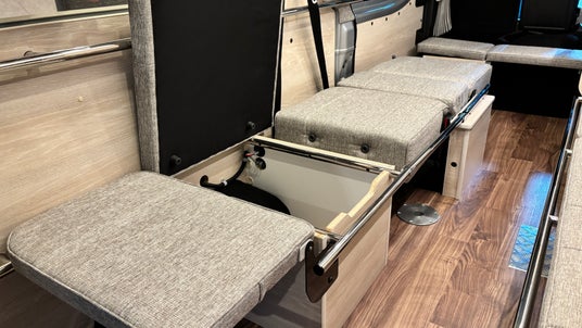 エントランス入ってすぐ右手に前向き、後向き、フラットモードになる1人掛けマルチシートが設置されています。ひじ掛けも付いて快適です。横向きの3人掛けシートは2点式シートベルト付。すべてのシートをフラットにすれば大人2人と子供1人が就寝できる広々としたスペース(長さ2300mm×最大幅1500mm)に早変わりします。マルチシートを後向きモードにすれば、サードシートと対座になるダイネットが完成。着脱式テーブルを移動させれば横向き3人と合わせて5名でテーブルを囲むことができます。