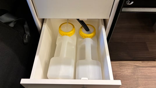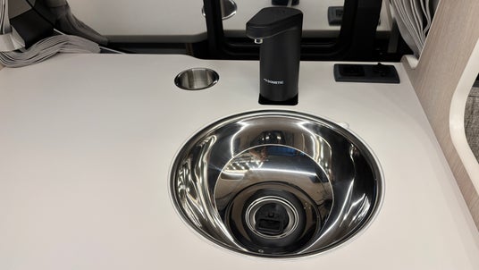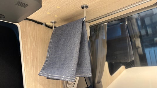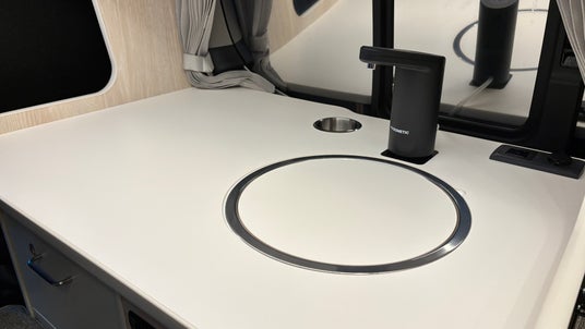 丸型シンクには蓋がついており、使用しない時はスペースを広く有効活用できます。マグネット式ポータブルウォータータップは取外し可能なので車外で使用することもできます。調理カウンターの上部にはタオルハンガー、電子レンジ、下部には58Lの冷蔵庫、収納スペース、清水タンク・排水タンク(各12L)を完備し、料理しやすい環境を整えました。