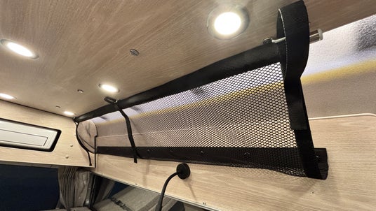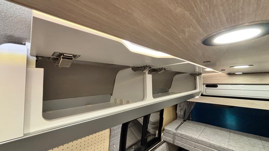 横向きシート(3人掛け)の上部には、衣類や小物をたっぷり収納できる収納棚を設置しました。