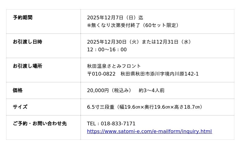 秋田温泉さとみ(所在地:秋田県秋田市)では、熟練の板前がこだわり抜いた『特選三段重おせち』の予約受付を2025年12月7日(日)迄、受付中です。60セット限定で、12月30日(火)または12月31日(水)のお引渡しにて販売しております。