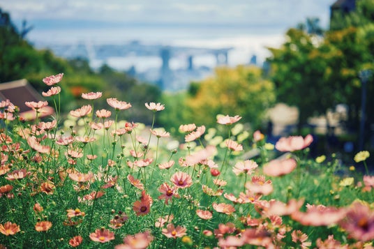 コスモス畑から望む神戸の街並み