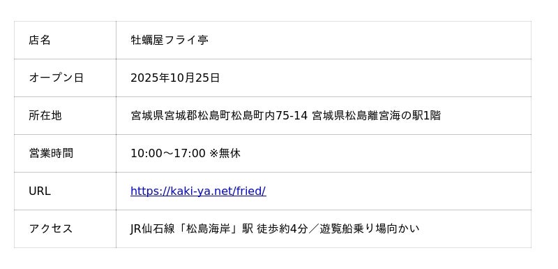 牡蠣の旬が到来する日本三景・松島に、三陸牡蠣を贅沢に使った新名物“爆弾カキフライ(TM)”を提供するカキフライ専門店『牡蠣屋フライ亭』が、9月より一部営業を開始し多くのお客様にご来店いただいておりましたが、この度2025年10月25日(土)より正式にオープンいたします。