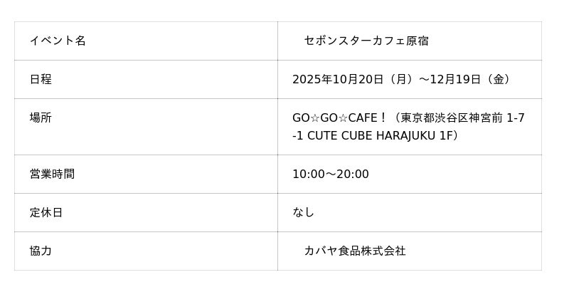 粧美堂株式会社、株式会社CANDY・A・GO・GO、カバヤ食品株式会社の3社が協働して、2025年10月20日(月)より期間限定で、原宿竹下通りにて、カバヤのオリジナル玩具菓子ブランド『セボンスター』と“原宿系バズるスイーツクリエイター”「しなこ」、"オモロカワイイ"原宿クリエイターアイドル「竹下☆ぱらだいす」によるコラボレーションカフェをオープンしますので、お知らせします。
