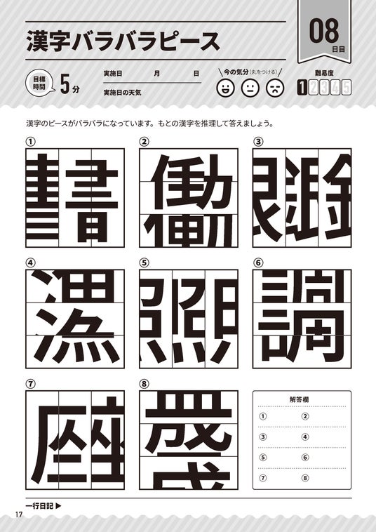 ・漢字バラバラピース:漢字のピースがバラバラになっているものから、もとの漢字を推理するこで「記憶力」UP!