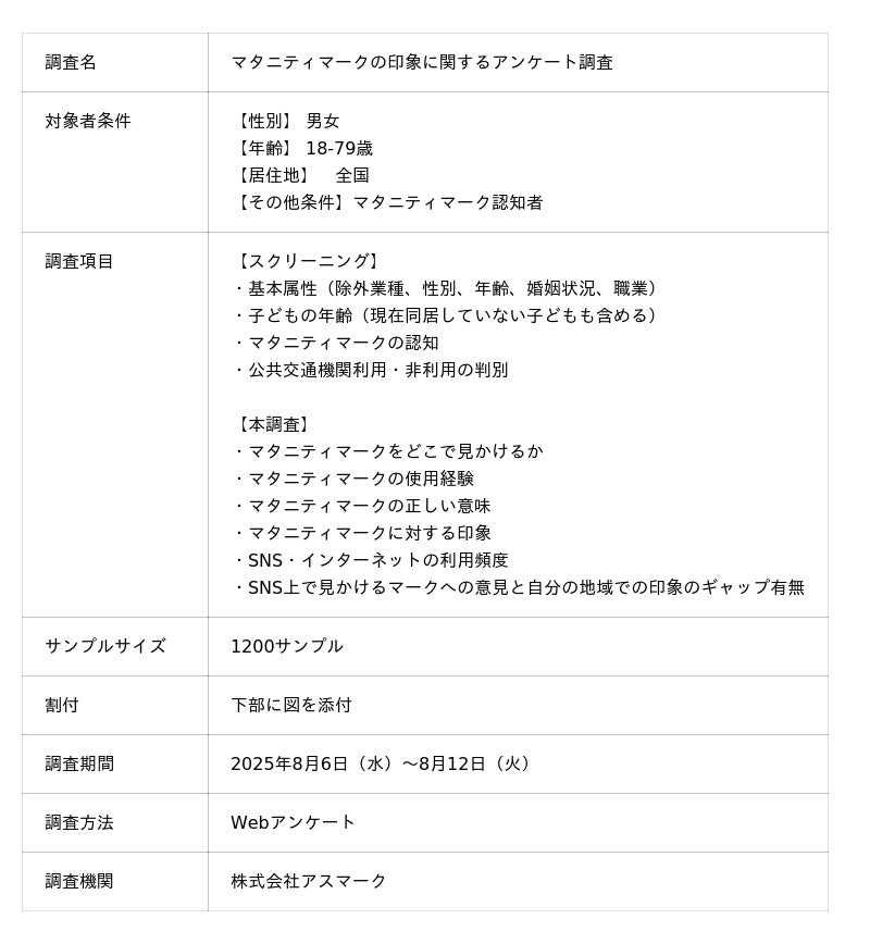 そこで今回は、マタニティマークの印象について調査するため、『マタニティマークの利用経験』や『マタニティマークの意味理解度』などの設問を含むアンケートを実施しました。