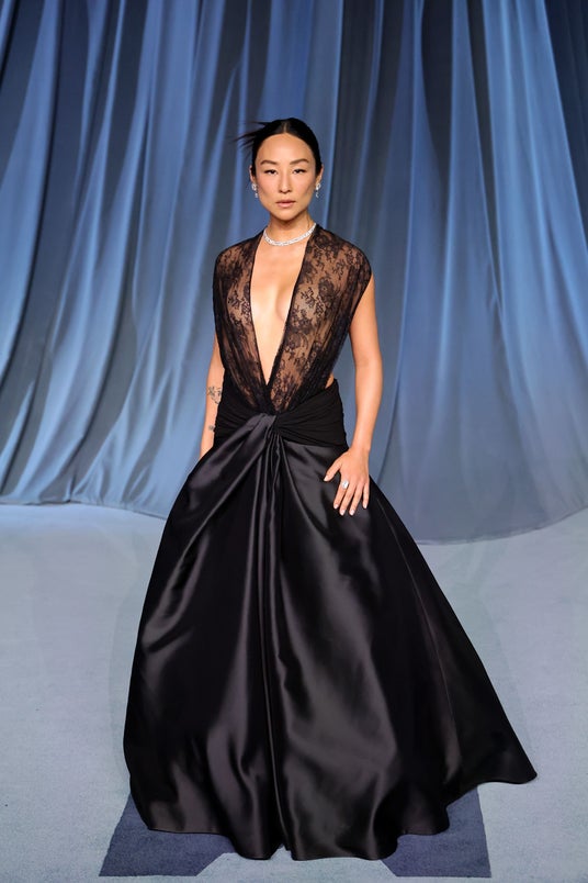 グレタ・リーは、ブラックレースをあしらったシルクのロングドレスを着用しました。