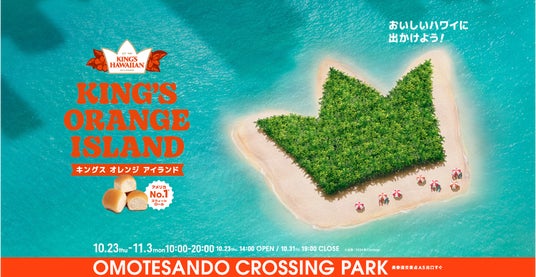 「KING’S HAWAIIAN」の日本本格上陸を記念したPOP UP「KING’S ORANGE ISLAND」では、ブランドの世界観を五感で堪能できます。表参道に突如出現したオレンジ色と南国の植物に包み込まれた島。会場に一歩足を踏み入れると、まるで南の島に瞬間移動したかのような特別な空間を体験できます。