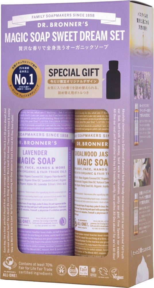 眠る前のひとときに、香る泡習慣。アメリカ発の世界的オーガニックボディケアブランド「ドクターブロナー」は優雅な香りを楽しむマジックソープ スイートドリームセットを2025年11月1日(土)から発売開始