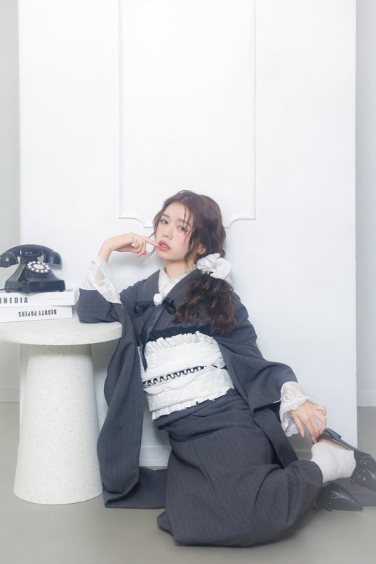 この度、aimme札幌店にて2026年2027年のご成人様に向けて、 大人気のaimmeオリジナル振袖『グレーストライプ』 を使用した新ビジュアルを撮影いたしました。 洋服よりインスピレーションを得たトレンド感のある1着。