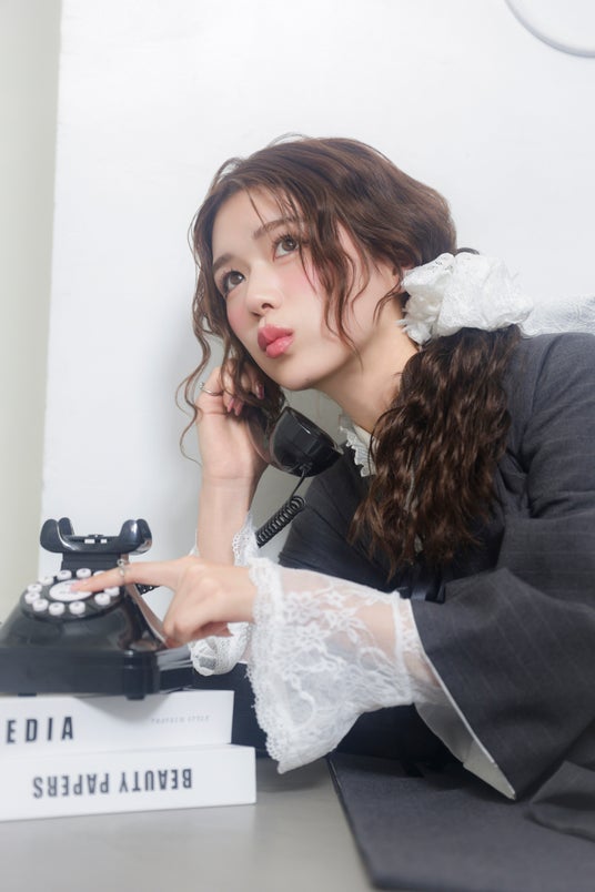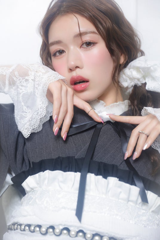 メイクは血色感のあるピンクトーンでガーリーな世界観を表現しています。