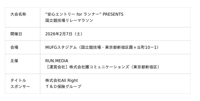 また、All Rightは、多様化するランナーのための配信型WEBマガジン『RUN.MEDIA』(運営:株式会社團コミュニケーションズ、社長:本間 宏通)が2026年2月7日(土)にMUFGスタジアム(国立競技場・東京都新宿区)で開催する「“安心エントリー for ランナー”PRESENTS 国立競技場リレーマラソン」に協賛します。