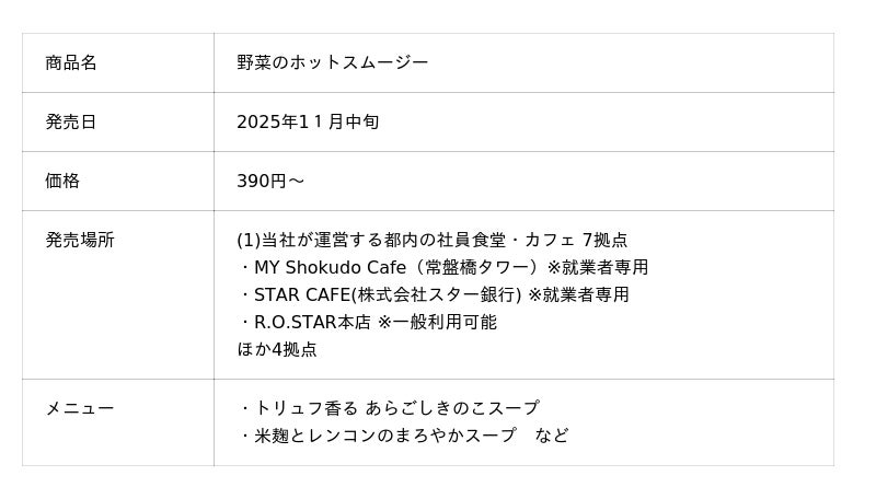 スムージー市場の拡大を背景に、冷えを感じやすいこれからの季節に“温かい”スムージーで身体を温めてほしいとの思いから、当社が運営するカフェにて11月中旬より「野菜のホットスムージー」をリニューアル発売します。今回から容器をスープカップからオリジナルデザインの紙コップへ刷新し、テイクアウトはもちろん、オフィス利用にも最適化することで、新しい“温活”を提案します。