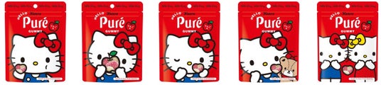 パッケージは、レトロかわいい雑貨のような全5種類のデザインで、ピュレグミを頬張ったり、ウインクをしたり、ハローキティの双子の妹ミミィと並んだりと、キュートな姿をお楽しみいただけます。