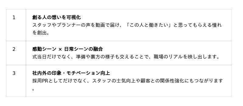 TikTokなどのショート動画を活用し、結婚式場の裏側にある「人」のストーリーや日常の風景を伝えることで、求職者にとって「ここで働く自分」をよりリアルに想像してもらえるようになります。従来の「給与・待遇・勤務地」といった条件提示や、美しい式場写真だけでは、若年層の心を動かすことは難しくなっており、代わって重視されているのが、「【誰が】【どんな想いで】その職場をつくっているか」というストーリー性や共感できる人柄です。