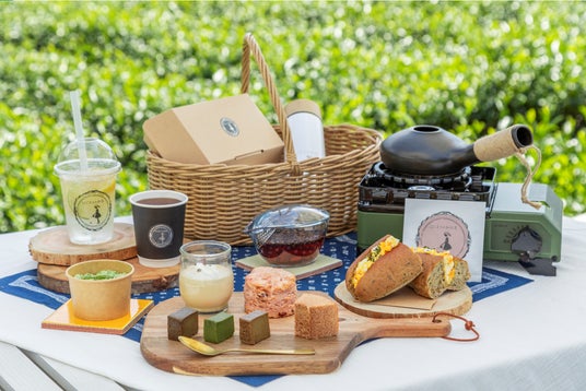 はじまりの紅茶TerraceCafeアールグレイ香る美黄卵サンド、抹茶のポタージュ、いちごミルクティーバウムに、石垣いちごとフランボワーズのスコーン、お茶のテリーヌ3種。ジンライム香る春緑茶ソーダがスイーツをさっぱりまとめてくれます。食後は自分で焙煎して淹れる和紅茶の焙じ茶を。お茶の香りを存分に楽しめる特別なピクニックセットです。