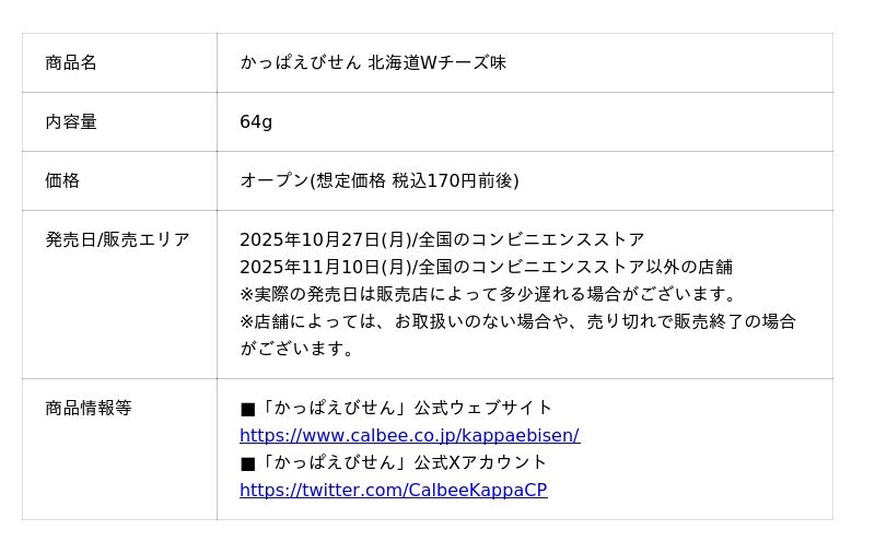 カルビー株式会社(本社:東京都千代田区、代表取締役社長兼CEO:江原 信)は、“やめられない、とまらない♪”でおなじみの「かっぱえびせん」より、北海道製造のチェダーチーズ※1とカマンベールチーズ※2のWチーズを使用した秋冬限定の『かっぱえびせん 北海道Wチーズ味』を2025年10月27日(月)から全国のコンビニエンスストア先行で期間限定発売します。コンビニエンスストア以外の店舗では、同年11月10日(月)から期間限定発売します(2026年1月中旬終売予定)。※1チェダーチーズパウダーには北海道製造チェダーチーズを100%使用しています。※2本品には北海道製造カマンベールチーズをカマンベールチーズパウダーとして0.04%使用しています。