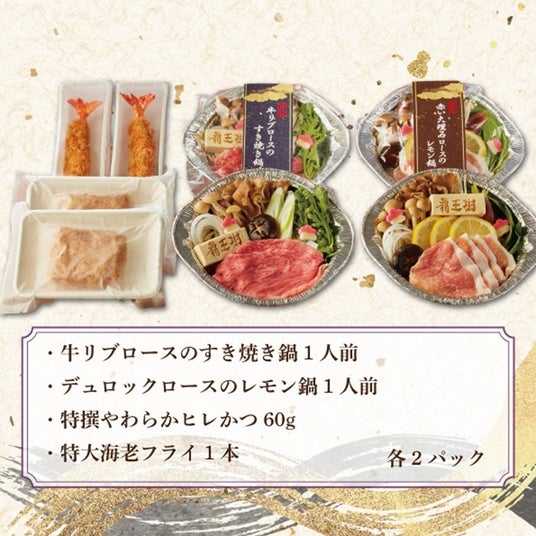 (2個セット)”牛リブロース”すき焼き鍋1人前、”デュロックロース”レモン鍋1人前、特撰やわらかヒレかつ60g、特大海老フライ1本 各1パック