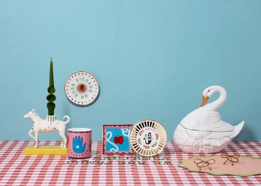 上から)キャンドルホルダー Baloo(約17.5x8.5×17.5cm)69,300円[現品限り]、フレグランスキャンドル(H約10.3×直径9.5cm)13,200円[現品限り」、ゴールドリムスクエアトレイ Apple(約11×11cm)10,450円、ゴールドリムブレッドプレート(直径約15.5cm)各6,600円、スワンオブジェ(H約27.5×21cm)64,900円[現品限り」、リボンナプキンフォルダー set of 4(約7.5×直径4cm)9,350円、スカラップエッジラウンドプレイスマット(約38×38cm)5,830円、ギンガムチェック we are family テーブルクロス(約150x250cm)39,600円[現品限り]◎祝祭広場『アールデコインテリア』