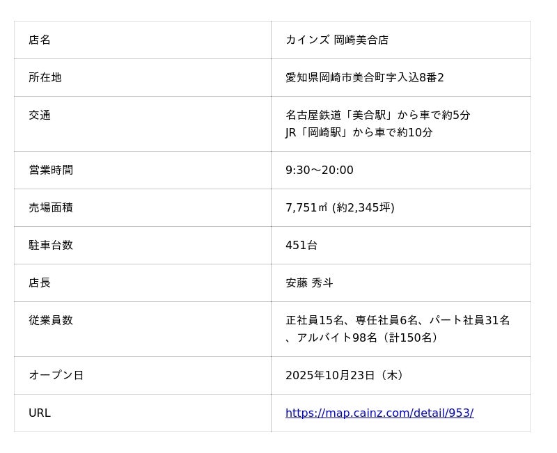 株式会社カインズ(本部:埼玉県本庄市、代表取締役社長 CEO:高家 正行)は、カインズ 岡崎美合店が2025年10月23日(木)に、愛知県岡崎市にグランドオープンすることをお知らせします。