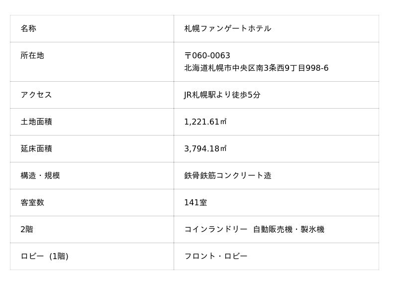 このたびホテル事業拡大の一環として、宿泊特化型ホテルへの参入を図り、「ホテルラフィナート札幌」を取得いたしました。当ホテルグループのコンセプトを体感いただく新たな拠点として位置づけるとともに、お客様の“楽しさの入口”となるホテルを目指し、「札幌ファンゲートホテル」に名称を変更いたしました。