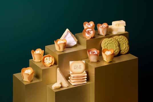 乳のうまさを突き詰めた『チューリップローズ チーズ』が誕生。ミルキーなチーズの味わいを目指して、フランス産クリームチーズ香るラングドシャクッキーにクリームチーズ&カマンベールの生食感ショコラクリームをしぼりました。贅沢なコクのカマンベールショコラを散りばめて、味わいのアクセントに。フランス産発酵バター&北海道ミルク仕立ての『チューリップローズ バター』と2味セットです。