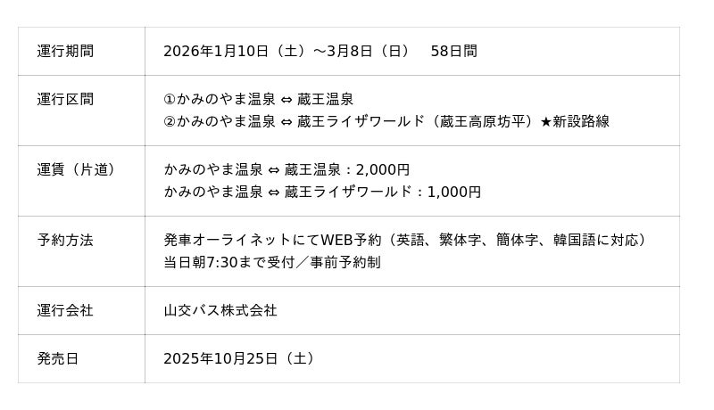 山形県・一般社団法人上山市観光物産協会(会長:五十嵐伸一郎)は、冬の観光シーズンに合わせ、かみのやま温泉発着「蔵王シャトルバス」の2年目となる運行を決定いたしました。