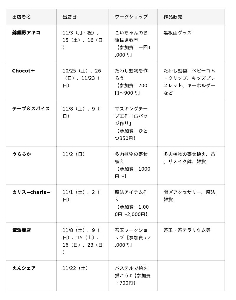 期間中は、インフォメーションセンターに特設ブースを設け、日替わりでクラフト作家が登場。お絵描き教室や、アクセサリー作り、苔玉作りなど、気軽に参加できるワークショップのほか、オリジナル作品やグッズの販売も実施。ものづくりの魅力に出会える特別な約1カ月をお楽しみいただけます。■期間/令和7年10月25日(土)~11月23日(日)