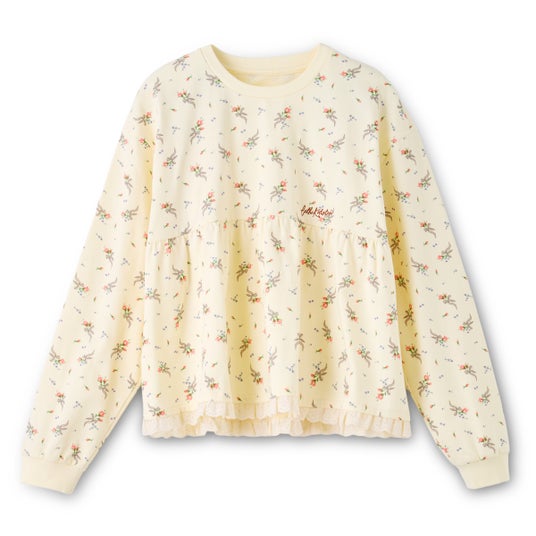 ギャザーフレアトップスCath Kidstonのアーカイブから、sowaさんが選出したアートをロングスリーブTシャツにプリント。レースのリボンが結ばれた小さな花束が優しい印象です。胸元のギャザーがフェミニンな印象をつくり、ゆったりとしたサイズ感は程よくカジュアルなので、デイリーに着用したい一着。裾のコットンレースがおしゃれ心をくすぐります。