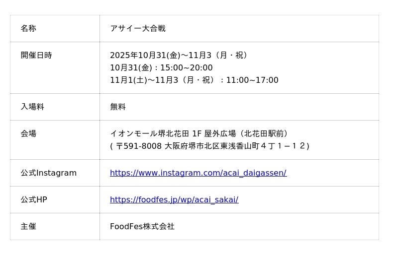 FoodFes株式会社(代表取締役:稲垣一馬)は2025年10月31日(金)~11月3日(祝・月)の4日間「アサイー大合戦」をイオンモール堺北花田(大阪府堺市)の1F 屋外広場(北花田駅前)にて開催いたします。