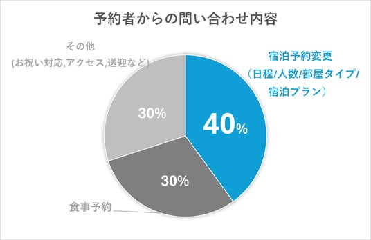 予約済みの方からの問い合わせの約4割が「人数」「部屋タイプ」「宿泊プラン」「日程」の宿泊予約変更の希望です。第1弾ではこれらの「急な予定変更で日程を変えたい」「参加する友人が増えた」「もっと広い部屋にしたくなった」といった、旅の計画段階で発生する変更をオンラインで完結できるようにします。